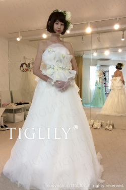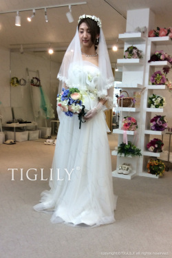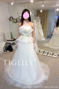 お花とグリーンの刺繍レースがポイントのウエディングドレス。