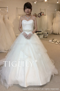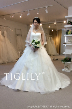 シンプルなハートカットビスチェに軽やかなオーガンジーフリルスカートが華やかなホワイトドレス。